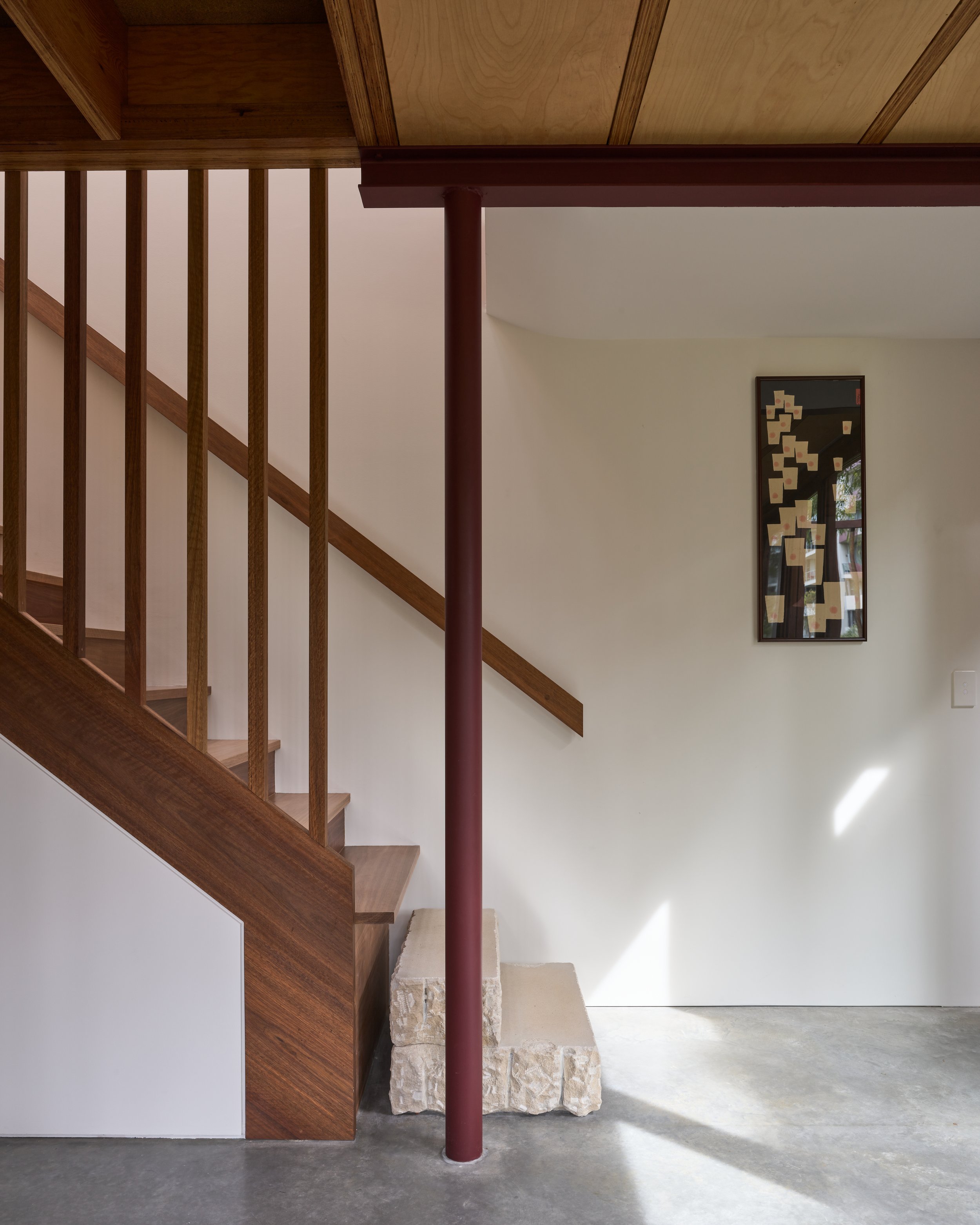 Tree House gently nestles between a heritage sandstone wall, a park and neighbouring houses. With a character of modern Australian vernacular, use of galvanised steel with recycled hardwood and brick allows the new addition to sit within the adjacent bush regeneration site, while permeable batten fencing and native planting allows biodiversity to filter between the sites. The existing cottage and addition are wrapped in a high performance envelope and the strategic planning arrangement provides more equitable access and a strong connection to landscape - crafting a building which has material longevity and flexibility for future permutations. Through careful design strategies focused on both embodied and operational carbon, the home gives more energy back to the grid, and is calculated to be significantly carbon-negative over its lifetime.