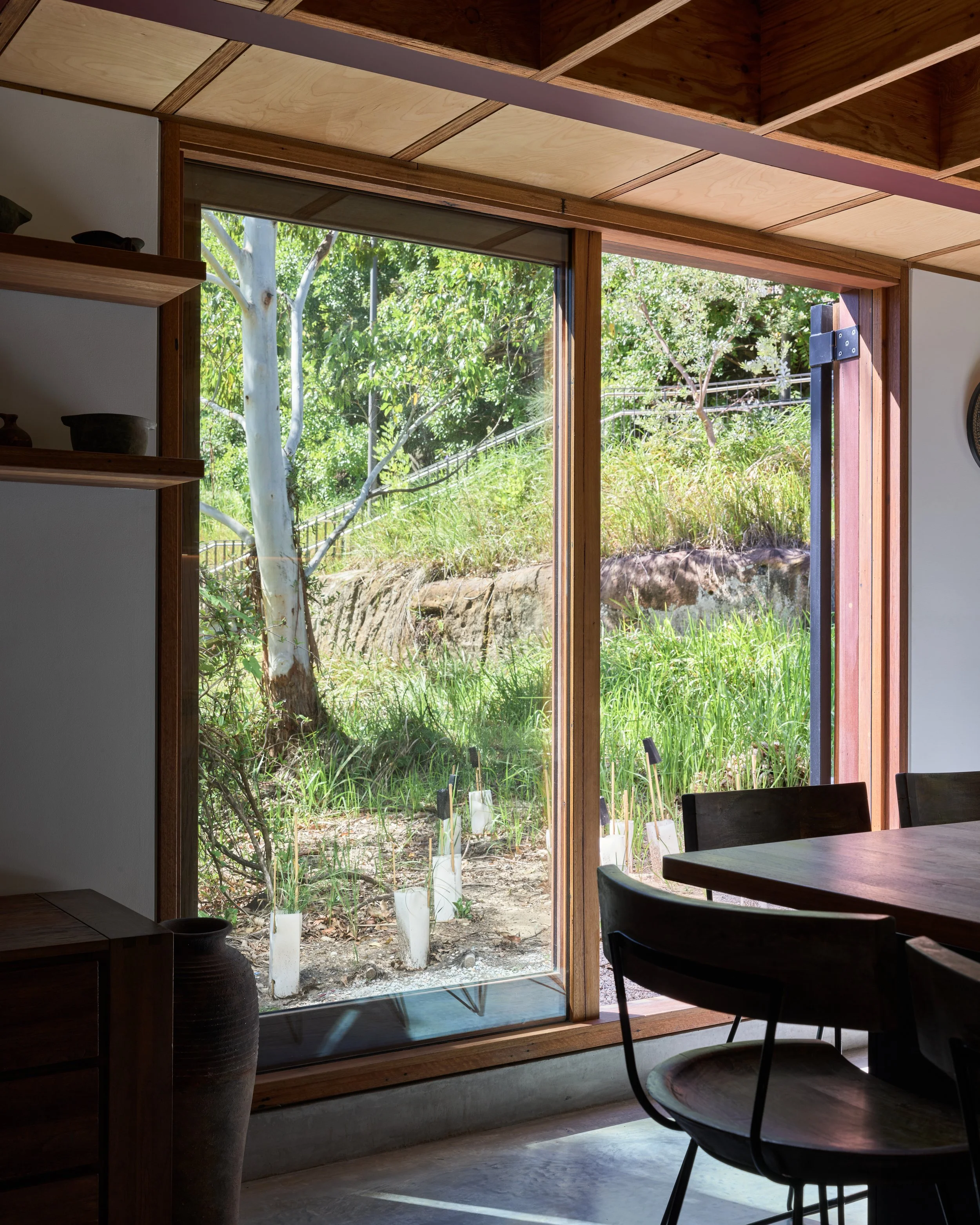 The position of the main living spaces give access to north-eastern light with large openings out to landscape to capture breezes and increase the connection to the trees. The emphasis on high performance design and robust construction has meant the final building is extremely thermally comfortable throughout the year with little heating and cooling required. This makes the home resilient and durable with longevity to contribute for generations to come.