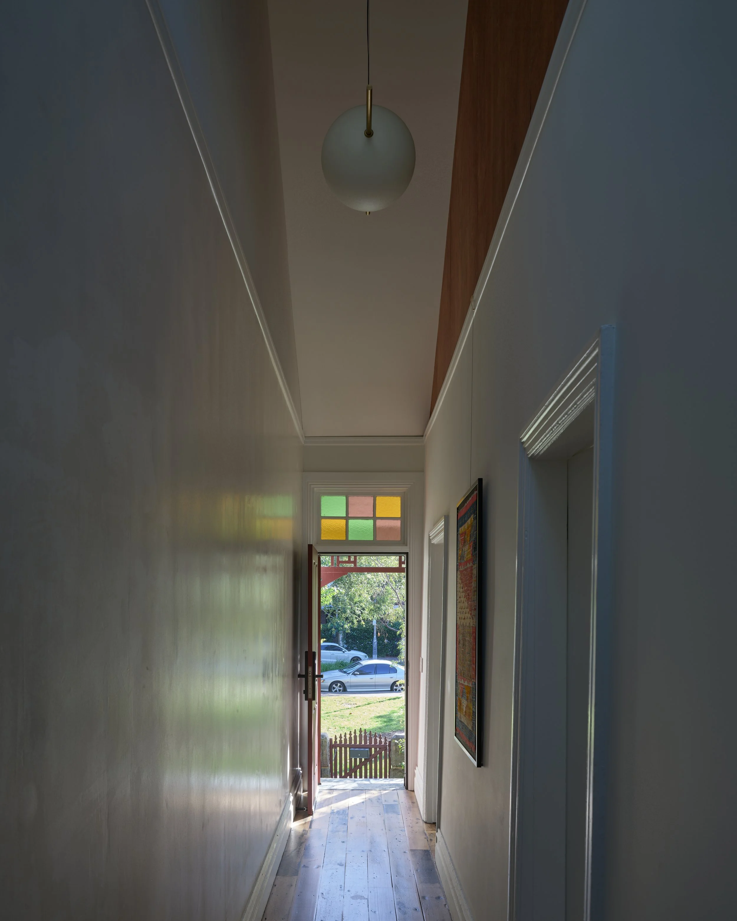 The projects dynamic position between a public park, attached neighbouring dwelling and a heritage contributing sandstone wall became an important catalyst for the plan arrangement and sensitive material selection. The design respectfully softens into to the landscape with recycled hardwood timber and galvanised sheets which reflect the surroundings. The two main front rooms of the cottage were retained and heritage features were reinstated. The degraded rear was deconstructed and the 2 storey addition is separated from the main form with a courtyard, barely peaking about the existing ridge line. Furthermore, the extensive native planting and the open batten fence allows a degree of privacy from the park whilst allowing the site to act as an extension to the landscape.